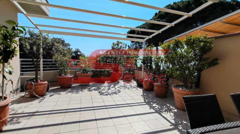 La zona notte è composta da tre camere da letto spaziose, tutte dotate di parquet, e due bagni moderni. Un ripostiglio con accesso a una veranda/lavanderia completa la disposizione interna, rendendo questo attico non solo elegante ma anche funzionale.
